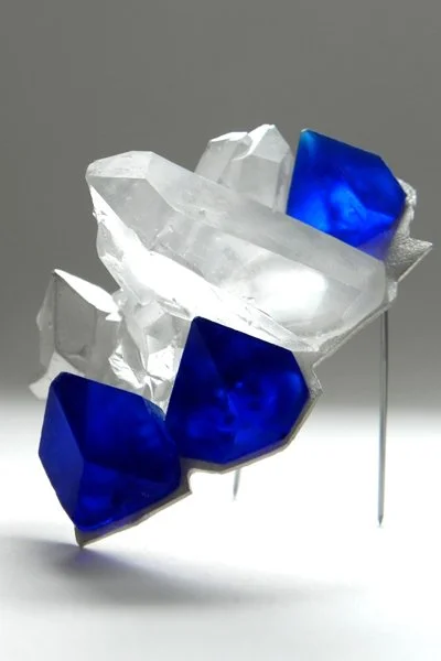 Francesca Flynn, Glasgow School of Art, whose sparkling crystalline collection epitomizes the title of the exhibition, Out The Blue, explores the facets of natural and constructed crystals creating vibrant jewellery. Edinburgh College of Art graduate Mariko Sumioka is inspired by the natural materials used in Japanese architecture and creates elegant pieces that interact sculpturally with the human body.