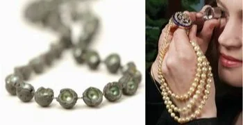 ‘‘Dishonest Pearls’ necklace by Laura Deakin - wood filler, synthetic pearl lustre, silk thread and pigment with Susan Rumfitt examining a Victorian pearl necklace with enamel and diamond clasp c1860