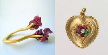 ‘‘Two Claw Cluster’ ring by Kelvin Birk - 22ct gold, rubies and pink agate, with ‘REGARD’ gold heart pendant - Ruby, Emerald, Garnet, Amethyst, Ruby, Diamond c1840