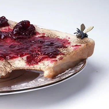 Max Danger, Copenhagen, a prize winning Royal College of Art graduate who finely carves, using modified sewing needles, gorgeous golden bees – Bee Pins on jammy toast, a Honey Drop gold Pinky ring and even a Bee Tea Infuser. All inspired by his research into urban bee keeping highlighting the vital role bees play in our lives.