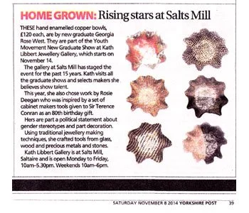 THESE hand enamelled copper bowls, £120 each, are by new graduate Georgia Rose West. They are part of the Youth Movement New Graduate Show at Kath Libbert Jewellery Gallery, which starts on November 14.