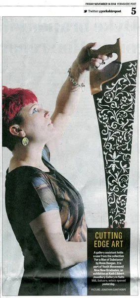 A gallery assistant holds a saw from the collection 'For a Man of Substance' by Rosie Deegan. It is part of Youth Movement! Nine New Graduates, an exhibition at Kath Libbert Jewellery Gallery in Salts Mill, Saltaire, which opened yesterday.