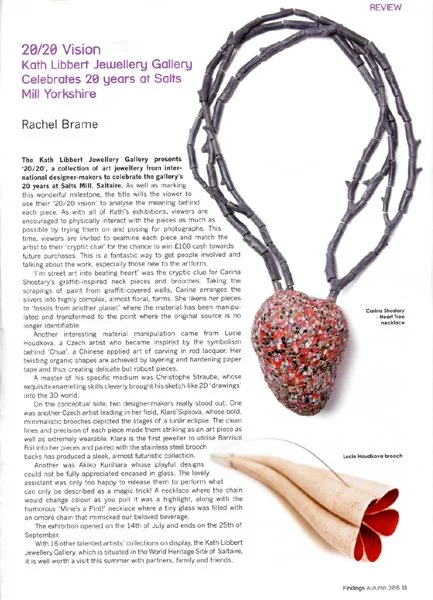 The Kath Libbert Jewellery Gallery presents '20/20', a collection of art jewellery from international designer-makers to celebrate the gallery's 20 years at Salts Mill, Saltaire. As well as marking this wonderful milestone, the title wills the viewer to use their '20/20 vision' to analyse the meaning behind each piece. As with all of Kath's exhibitions, viewers are encouraged to physically interact with the pieces as much as possible by trying them on and posing for photographs. This time, viewers are invited to examine each piece and match the artist to their 'cryptic clue' for the chance to win £100 cash towards future purchases. This is a fantastic way to get people involved and talking about the work, especially those new to the artform.