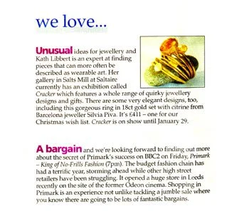 Unusual ideas for jewellery and Kath Libbert is an expert at finding pieces that can more often be described as wearable art. Her gallery in Salts Mill at Saltaire currently has an exhibition called Cracker which features a whole range of quirky jewellery designs and gifts. There are some very elegant designs, too, including this gorgeous ring in 18ct gold set with citrine from Barcelona jeweller Silvia Piva. It's £411 - one for our Christmas wish list. Cracker is on show until January 29