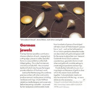 SILVER is just one of the materials featured in 'Schmuck' (trans. 'Jewellery'!), an exhibition of work by five German jewellery designers at the Kath Libbert Jewellery Gallery in Salts Mill, Saltaire.