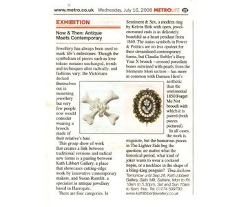 Kath Libbert Jewellery Gallery's current exhibition, which explores the differences and similarities between antique and contemporary jewellery, is split into four sections: Sentiment & Sex; Memento Mori; Power & Politics and The Lighter Side. These sections are designed to explore how we use accessories to commemorate special events and how jewellery-makers' methods, materials and motives have changed during the past 300 years.