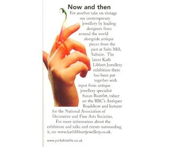 For another take on vinatage see contemporary jewellery by leading designers from around the world alongside antique pieces from the past at Salts Mill, Saltaire. The latest Kath Libbert Jewellery exhibition there has been put together with input from antique jewellery specialist Susan Rumfitt, valuer on the BBC's Antiques Roadshow and lecturer for the National Association of Decorative Fine Arts Societies.