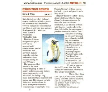 AT the Kath Libbert Jewellery Gallery from July 17 to September 28 there is a selling exhibition of themed contemporary jewellery called Now and Then! The gallery is at the Salts Mill, Saltaire, West Yorkshire, a building recently described as "a wonderful architectural setting that is obviously inspiring" .