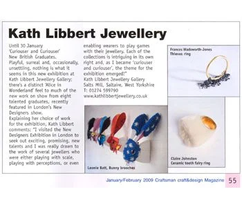 I was pleased that I decided to make the trip from Somerset to Saltaire for the preview of the exhibition. Seeing my work in the gallery, displayed alongside other new jewellers, as well as established and successful ones, gave me increased confidence. The exhibition has been an excellent starting point for my career as a contemporary jeweller. It has allowed me to enter the stage between graduate and professional. The stage when you are still finding your feet needs the help and support that Kath has been able to offer.
