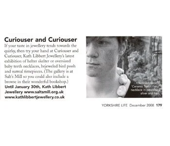 If your taste in jewellery tends towards the quirky, then try your hand at Curiouser and Curiouser, Kath Libbert Jewellery's latest exhibition of helter skelter or oversized baby teeth necklaces, bejeweled bird pooh and surreal timepieces. (The gallery is at Salt's Mill so you could also include a browse in their wonderful bookshop.)