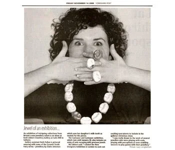 If tiny globules of gold attached in a semi-miraculous manner leave you cold, look at the extraordinary work of Claire Johnston, who brings a new meaning to the old joke of 'Tooth Hurty'. The ceramic tooth fairy series are porcelain, silver and gold, "and the big modelled necklace is strung on human hair".