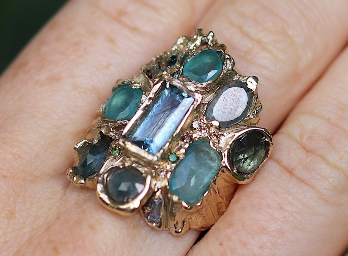 These are some of Sarah’s bespoke projects that feature a gorgeous myriad of gemstones in rainbow tones. Inspiration comes from forest themes and poetry. Found objects and lost histories spark her imagination and open up a world of possibilities. Please get in touch if you have a project that you would like to discuss.